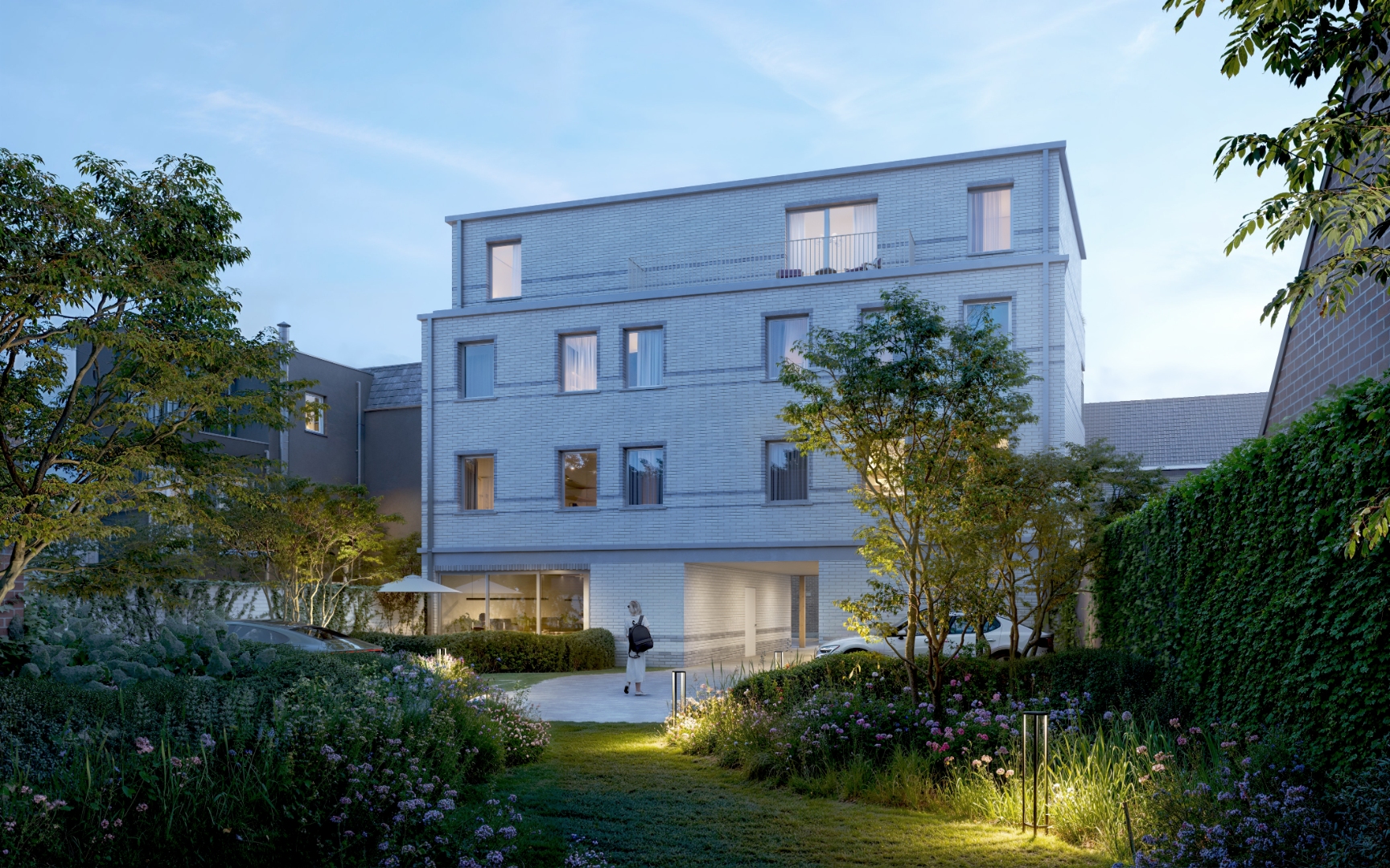 Het project beschikt over 6 bovengrondse parkeerplaatsen (laadpaalvoorbereiding), een afgesloten fietsenstalling, private bergingen en een aangelegde groenzone van 155 m².
